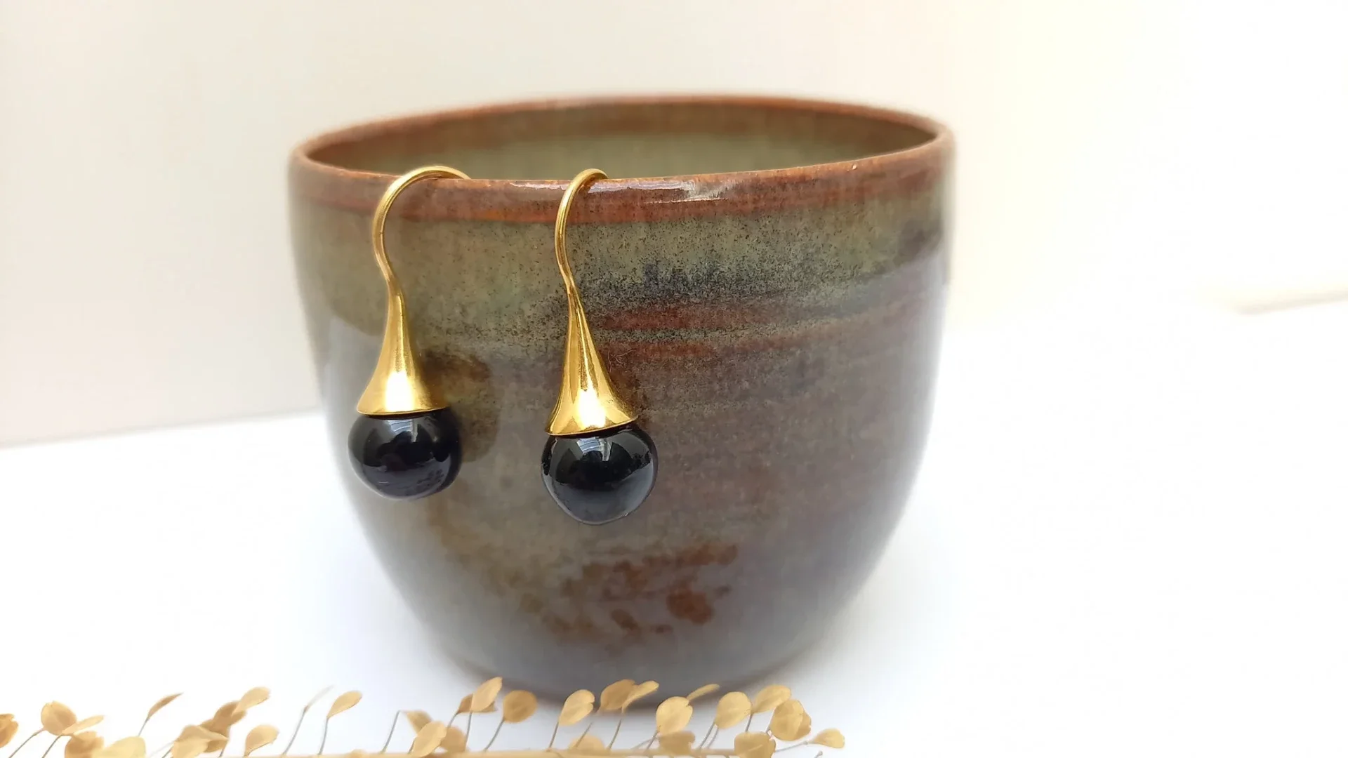 De parels worden samengebracht met vermeil gouden oorbellen. (= Sterling zilveren sieraden onderdelen (eerste gehalte zilver 925) verguld met twee lagen 24 karaats goud.)