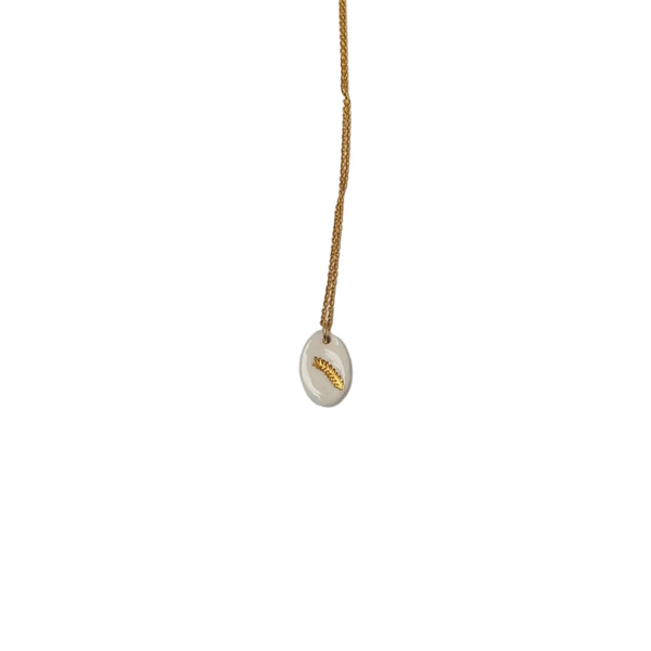 Het keramiek hangertje werd door mezelf gemaakt uit porselein. Deze werd gebakken op 1240°C om ze stevig te maken. Als laatste stap in het proces werd het gouden blaadje ingebakken op 730°C.