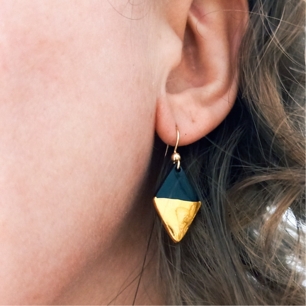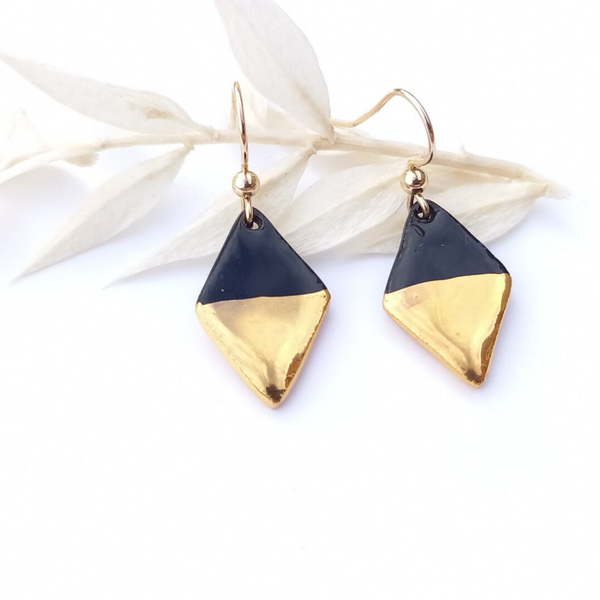 De zwarte glanzende porseleinparel werden door mezelf, de keramiste gemaakt, uit ingekleurde porseleinklei. Na het aanbrengen van een glazend glazuur werden de parels gebakken op 1240°C om ze stevig te maken. Als laatste werd een goudluster ingebakken op 730°C