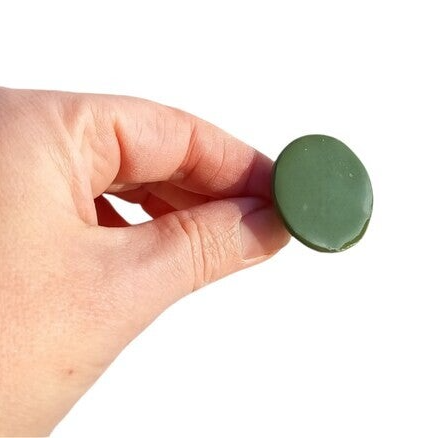 De parel werd door mezelf gemaakt uit ingekleurde witte porselein klei met een groen pigment. Het werd een eerste maal gebakken op 960°C om het daarna nog op te schuren en te schilderen met een transparant glazuur. Finaal is de parel gebakken op 1180°C om het af te werken.