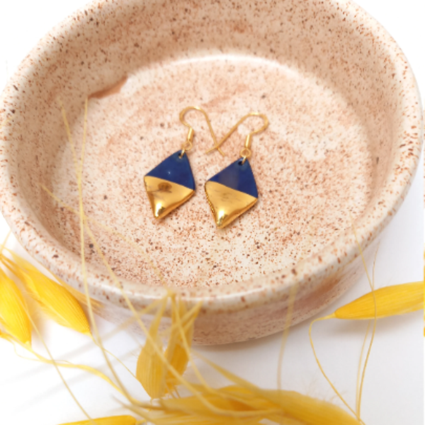 Blauw gouden ruitvormige porselein keramiek oorbellen - RVS goud