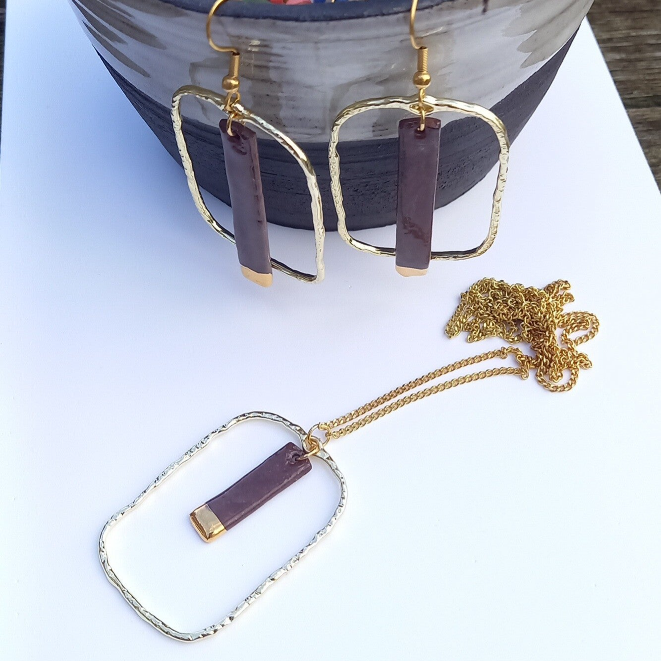 De bruine parel werd door mezelf gemaakt uit ingekleurde porseleinklei. De halsketting en gouden rechthoekige open parel zijn vermeil goud.