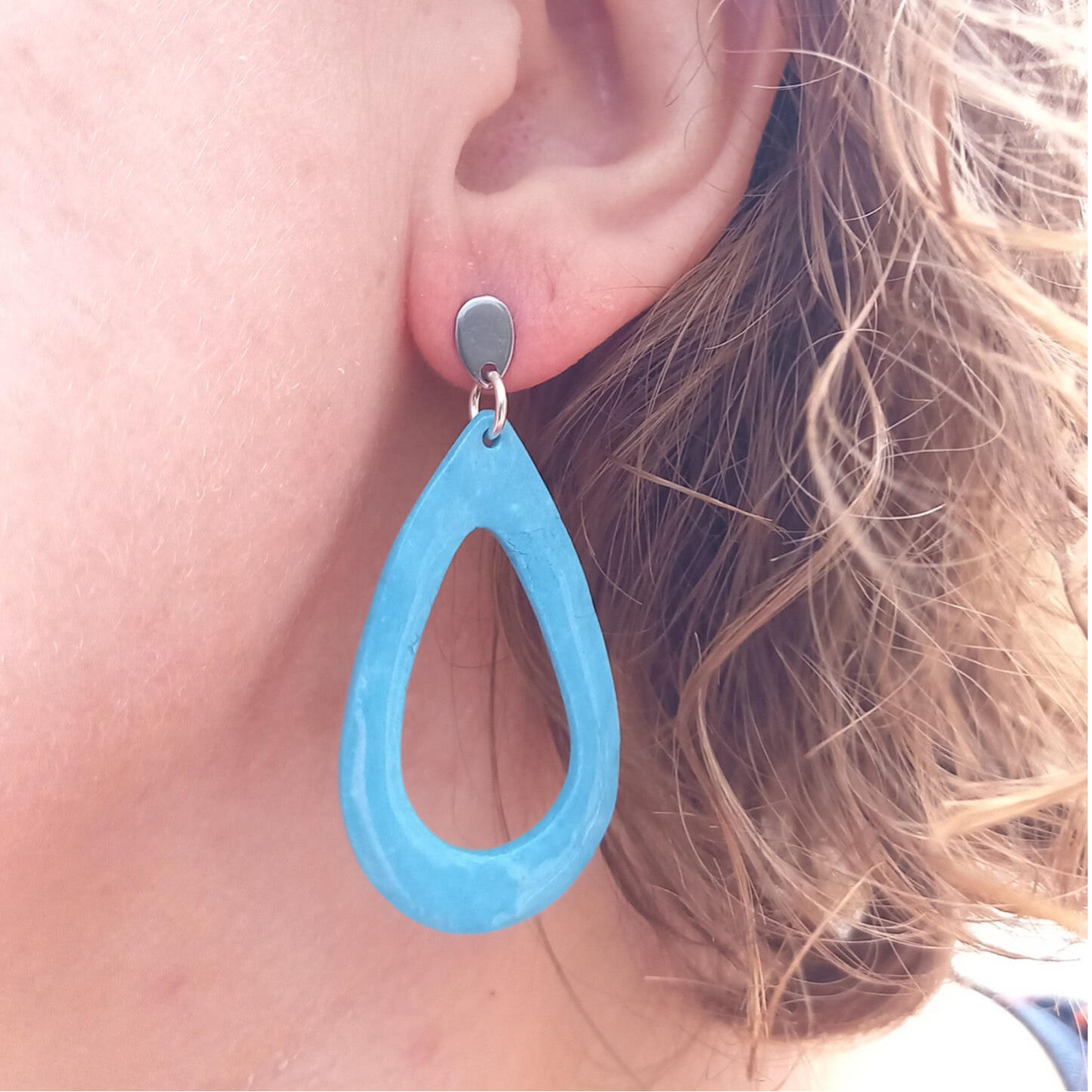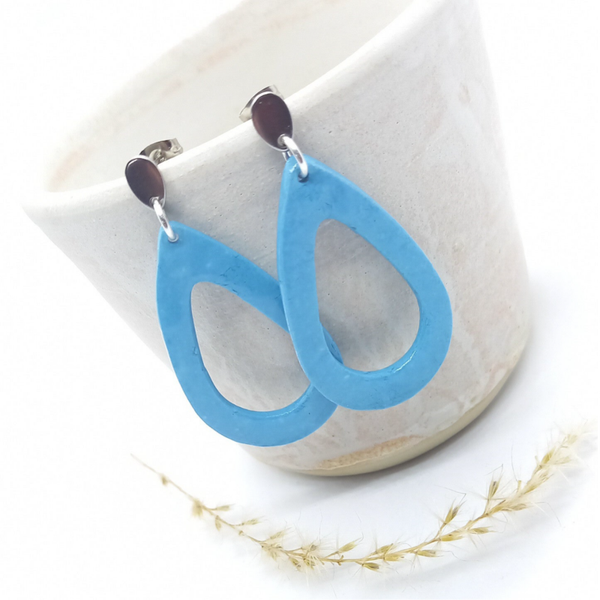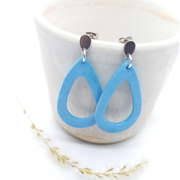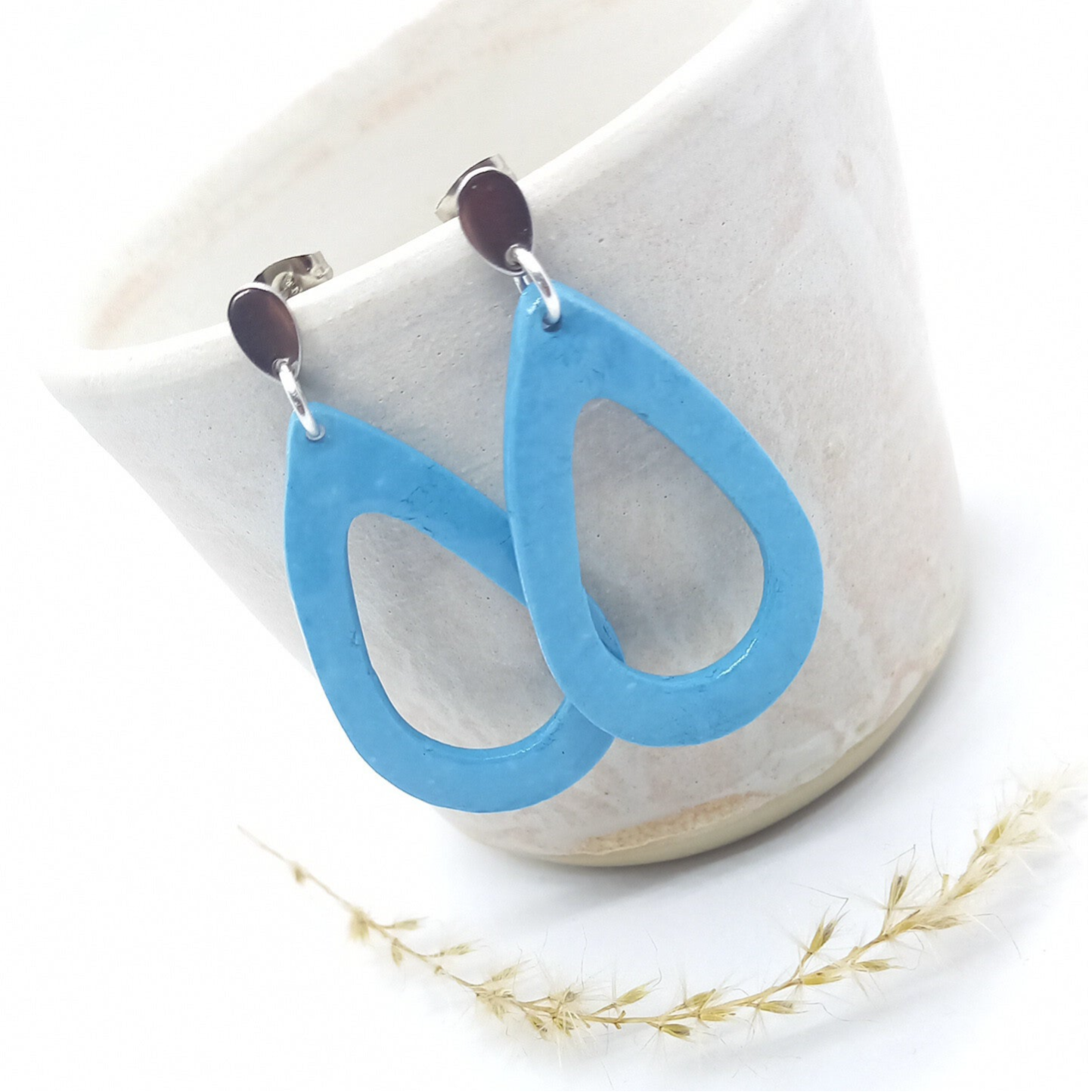 Porselein baby blauwe druppelvormige oorhangers aan RVS druppelvormige oorsterkers oorsteker