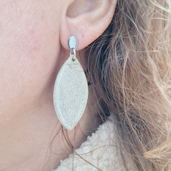 De witte rakuparels werden door mezelf gemaakt en samengebracht met RVS (chirurgisch staal - hyper anti-allergisch) oorstekers. Ontdek hier meer over mijn anit-allergische materialen