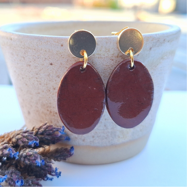 Donker bruine ovalen oorbellen aan gouden ronde oorstekers