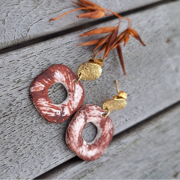 De roodbruine parels werden door mezelf gemaakt uit ingekleurde witte porseleinklei met een paars pigment.