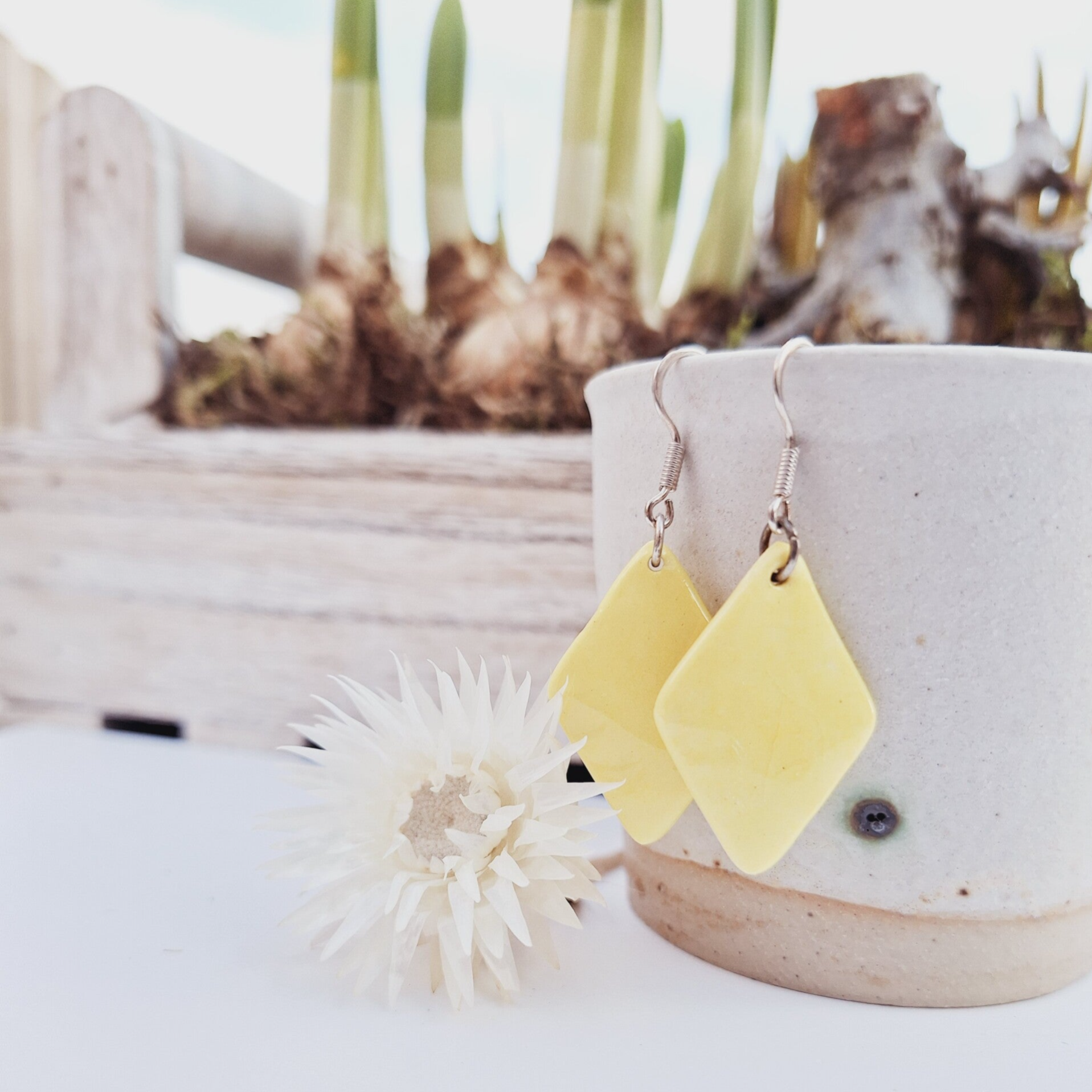 Gele ruit porselein oorbellen - zilveren oorhaak (AG925)