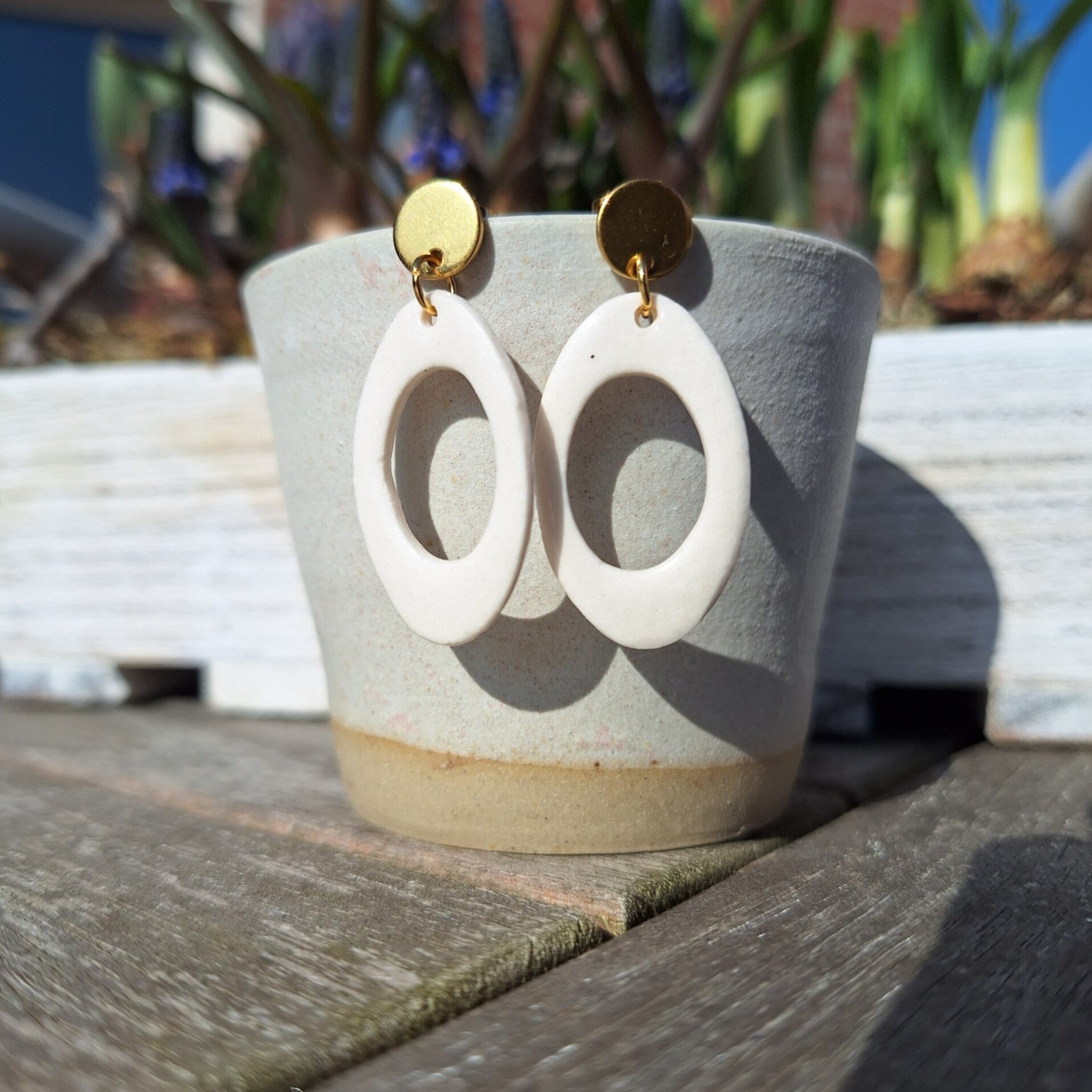 Witte open ovale porseleinparel - RVS goud ronde oorsteker