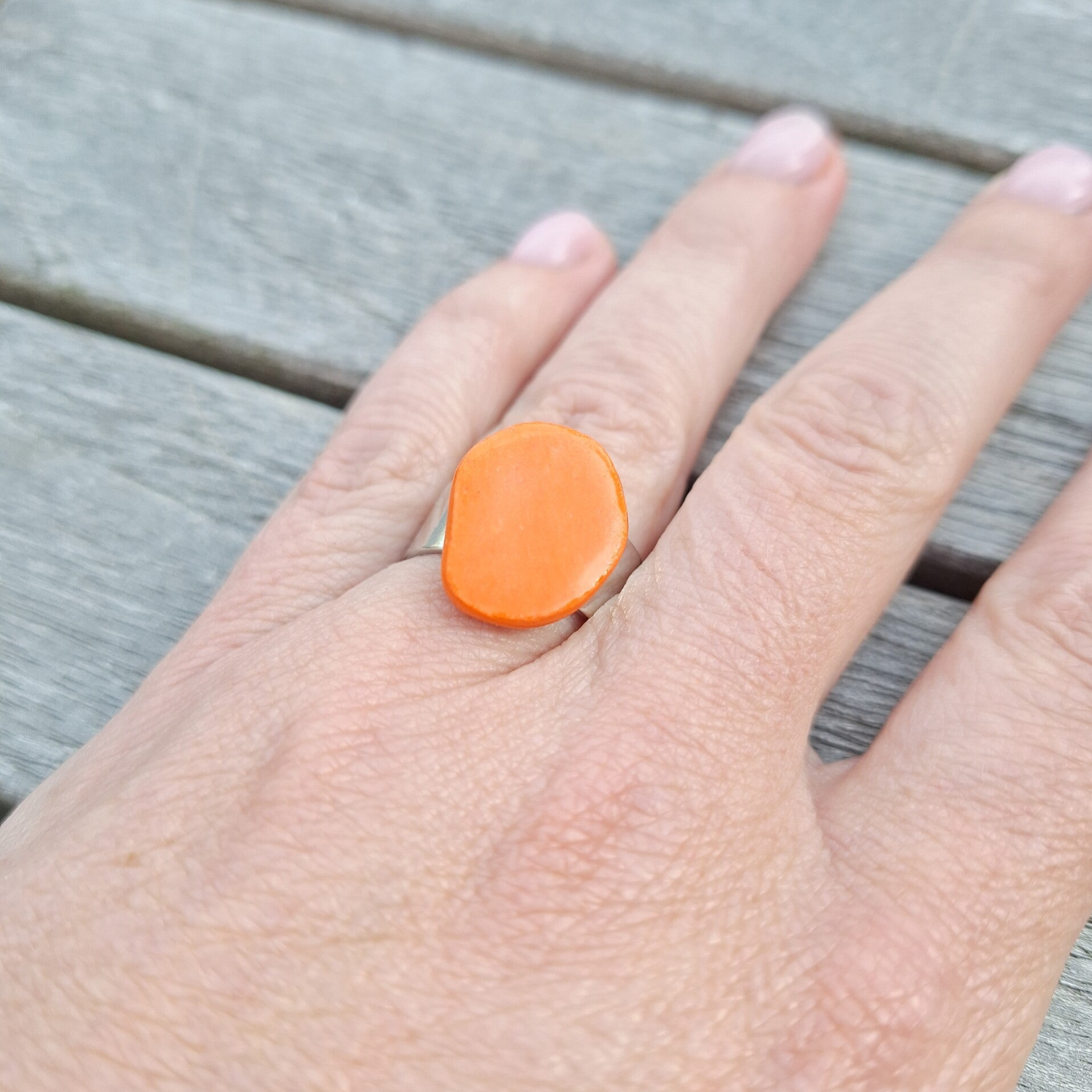 Warm oranje grillig rond porseleinparel - verstelbare ring - zilver