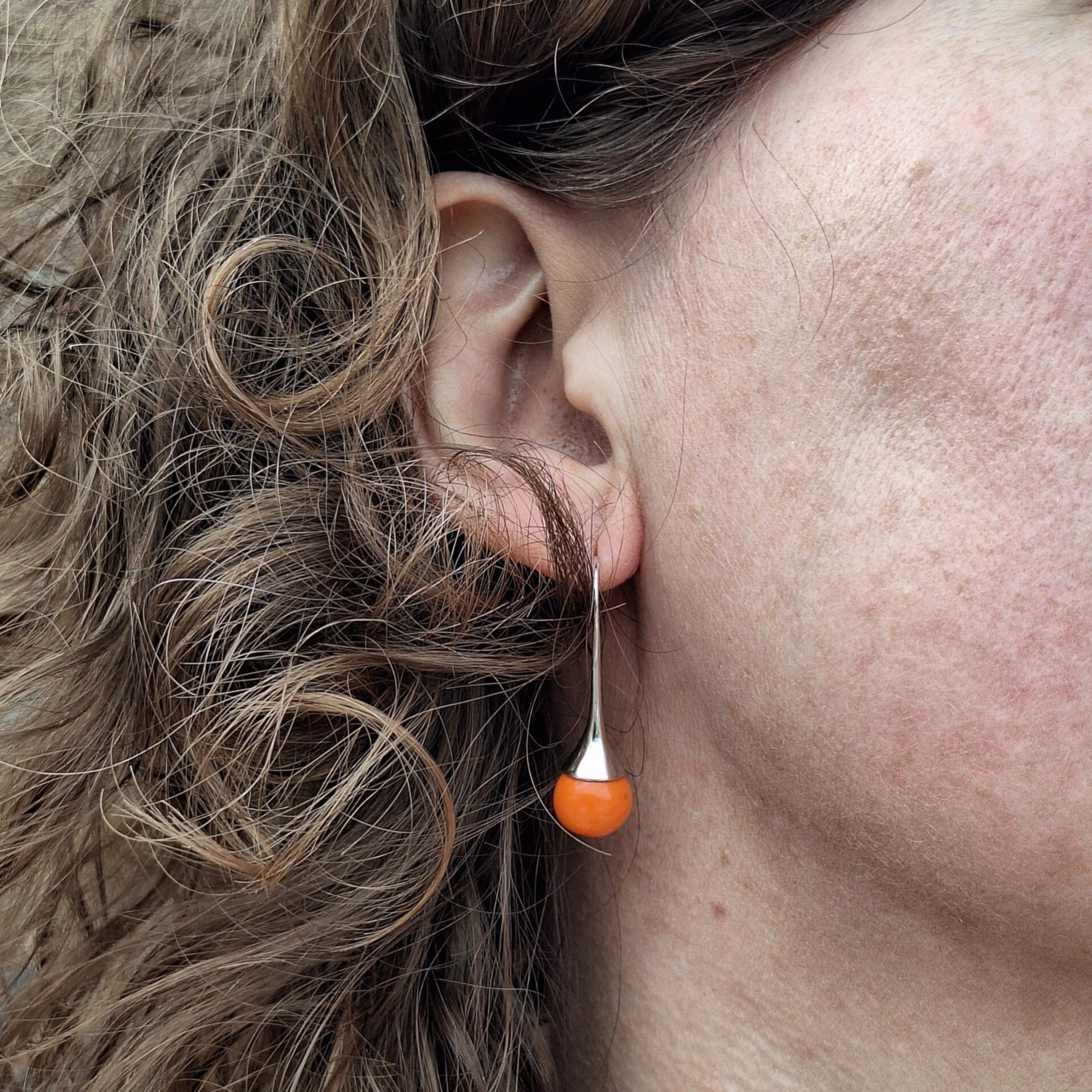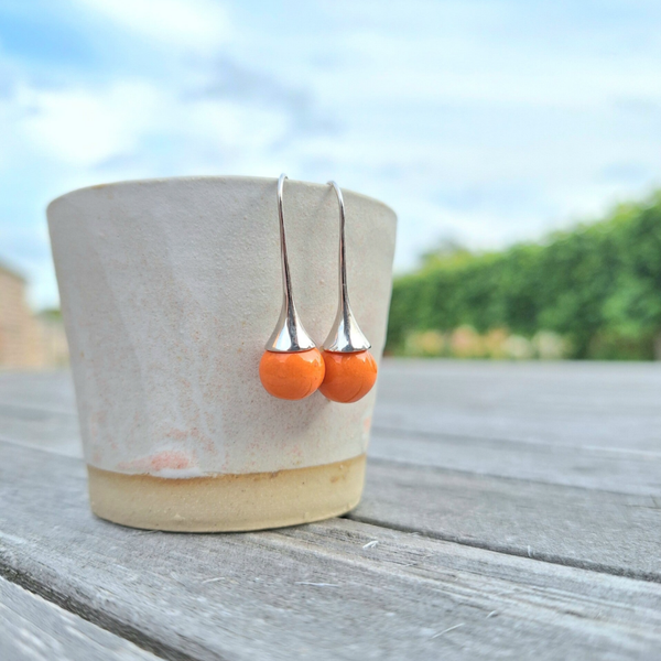 De parels werden door mezelf gemaakt uit ingekleurde porselein, beschilderd met glanzend glazuur. Ze werden gebakken op 1240°C.De oorhangers zijn sterling zilver