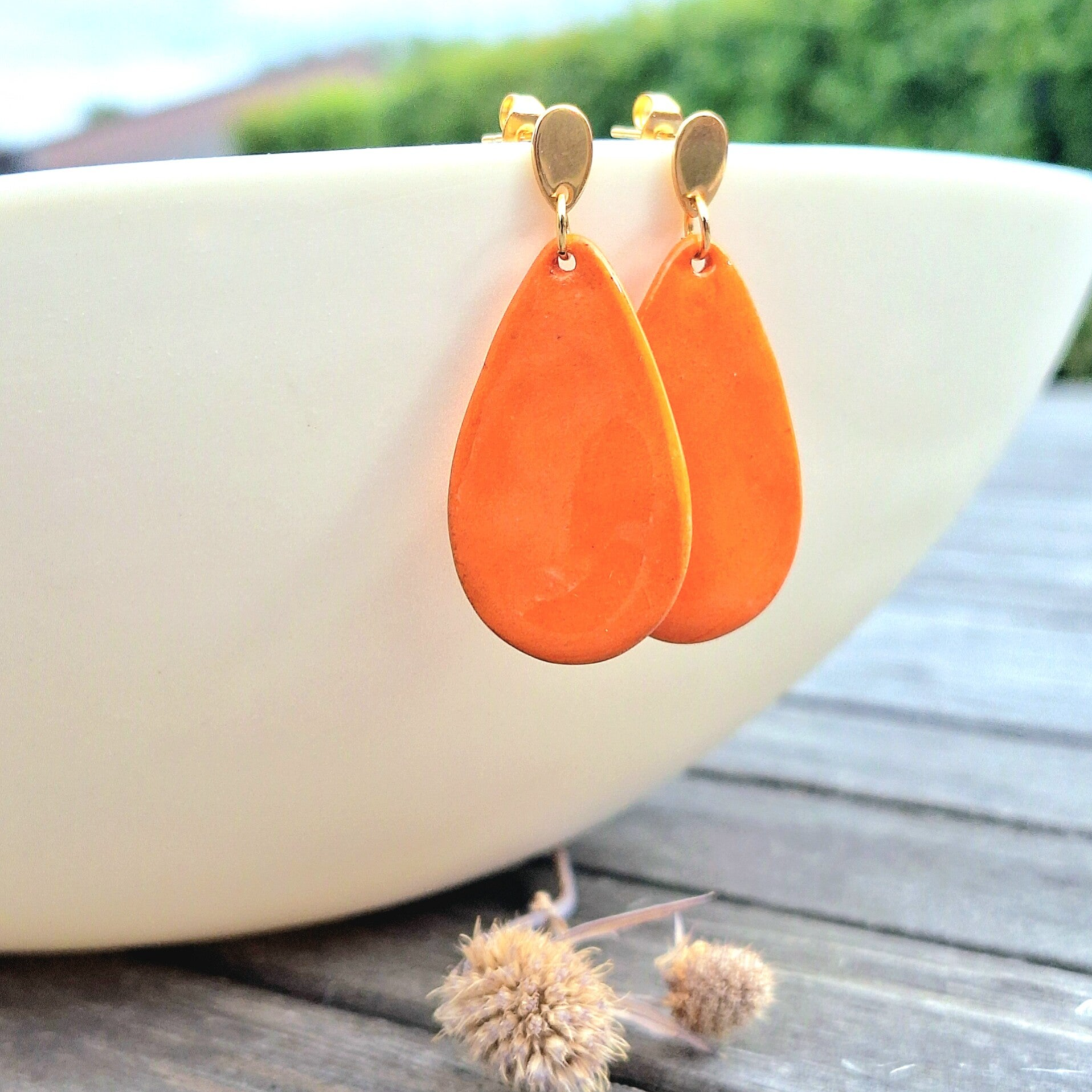 Warm oranje porseleindruppel - RVS goud druppel oorsteker