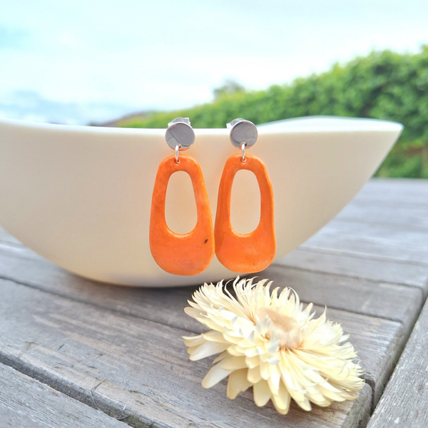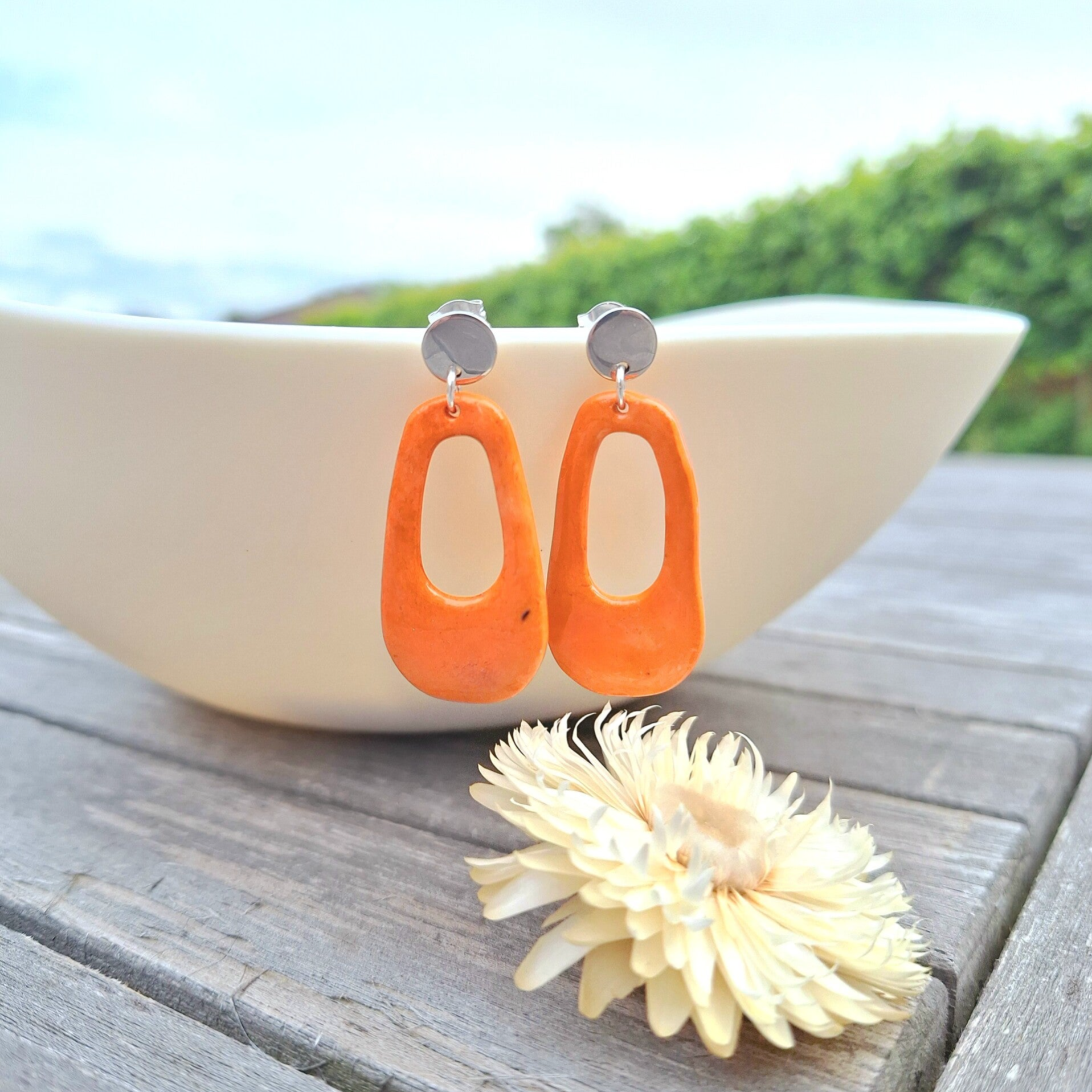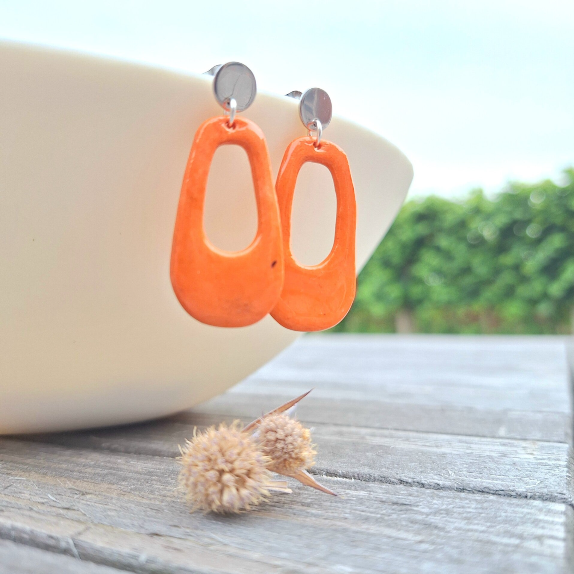 De glazend oranje keramiekparels werden door mezelf gemaakt uit ingekleurde porseleinklei met glanzend glazuur.