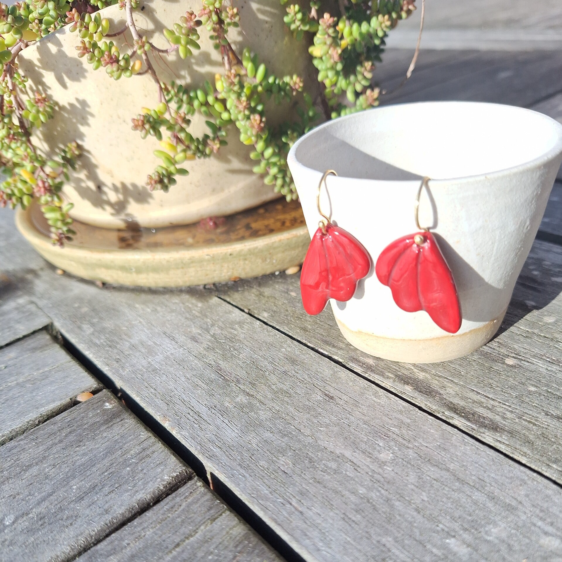 De bordeaux rode parels werden door mezelf gemaakt uit porseleinklei.