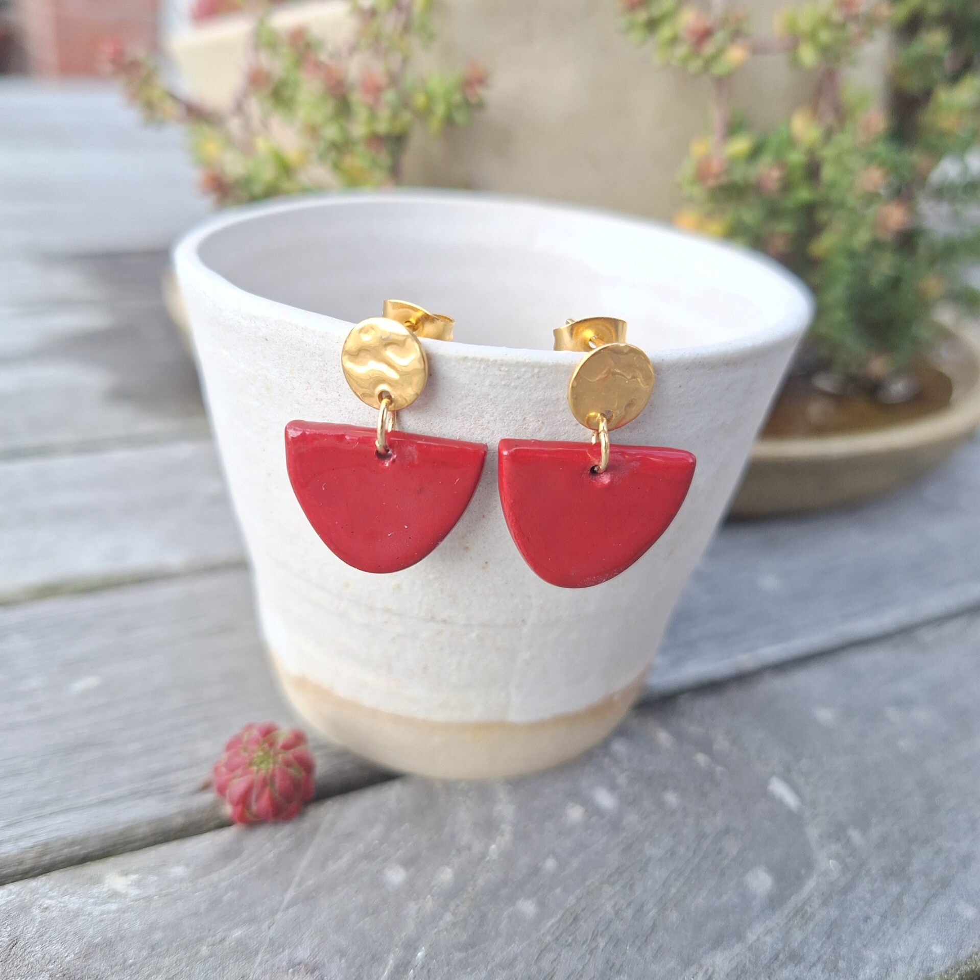 De bordeaux rode parels werden door mezelf, de keramiste, gemaakt uit porselein. Ze werden gebakken op 1240°C om ze stevig te maken bij een gewone val.