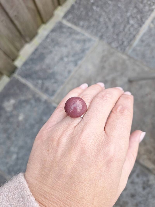 Aubergine paarse halve bol porseleinparel - verstelbare ring - zilver