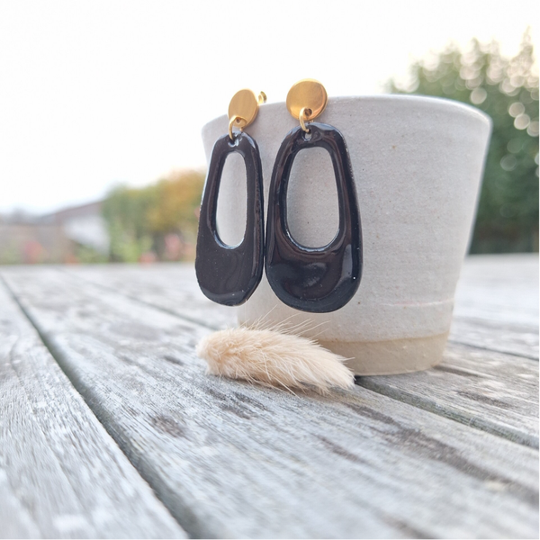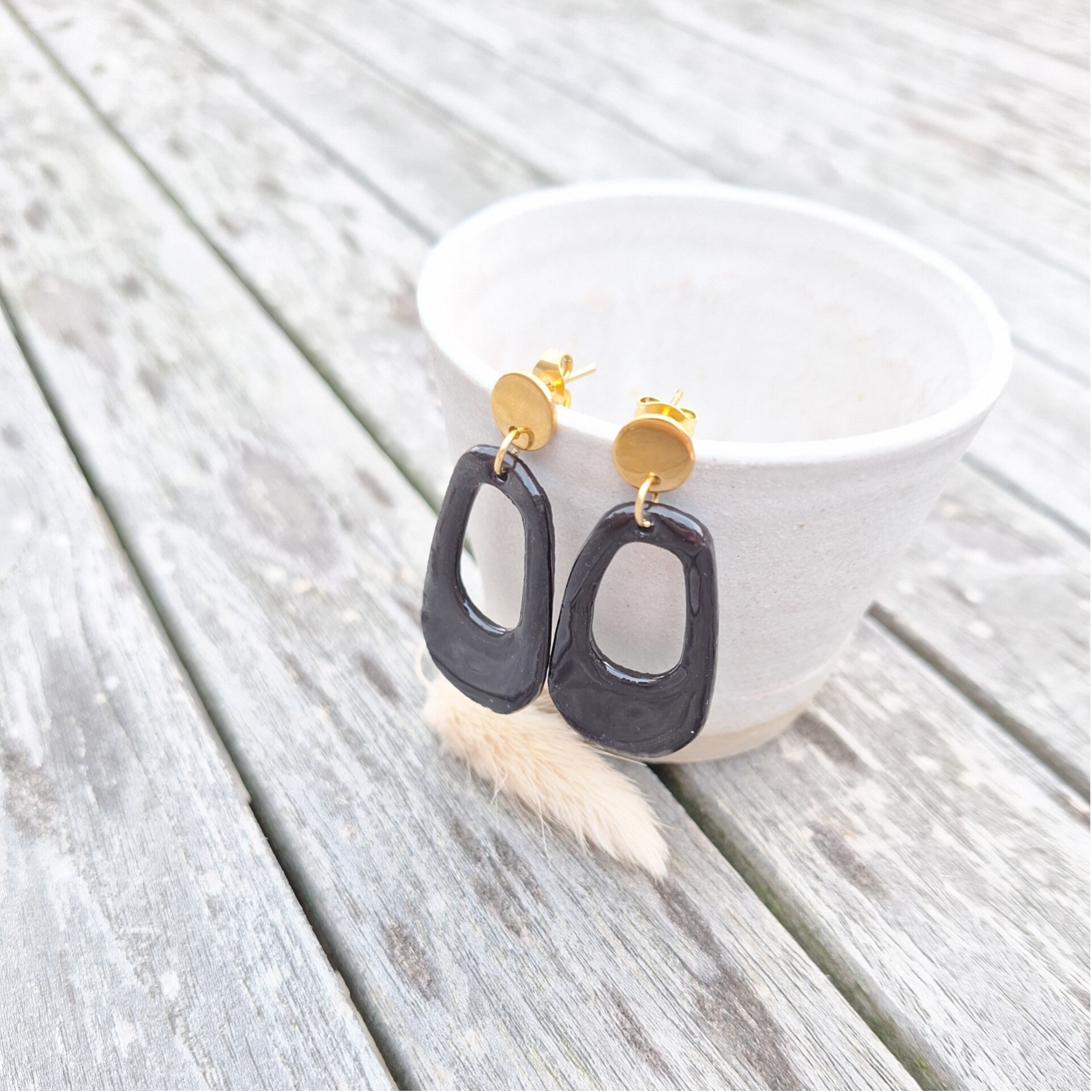 Zwarte porseleinparel - stainless steelen gouden oorsteker