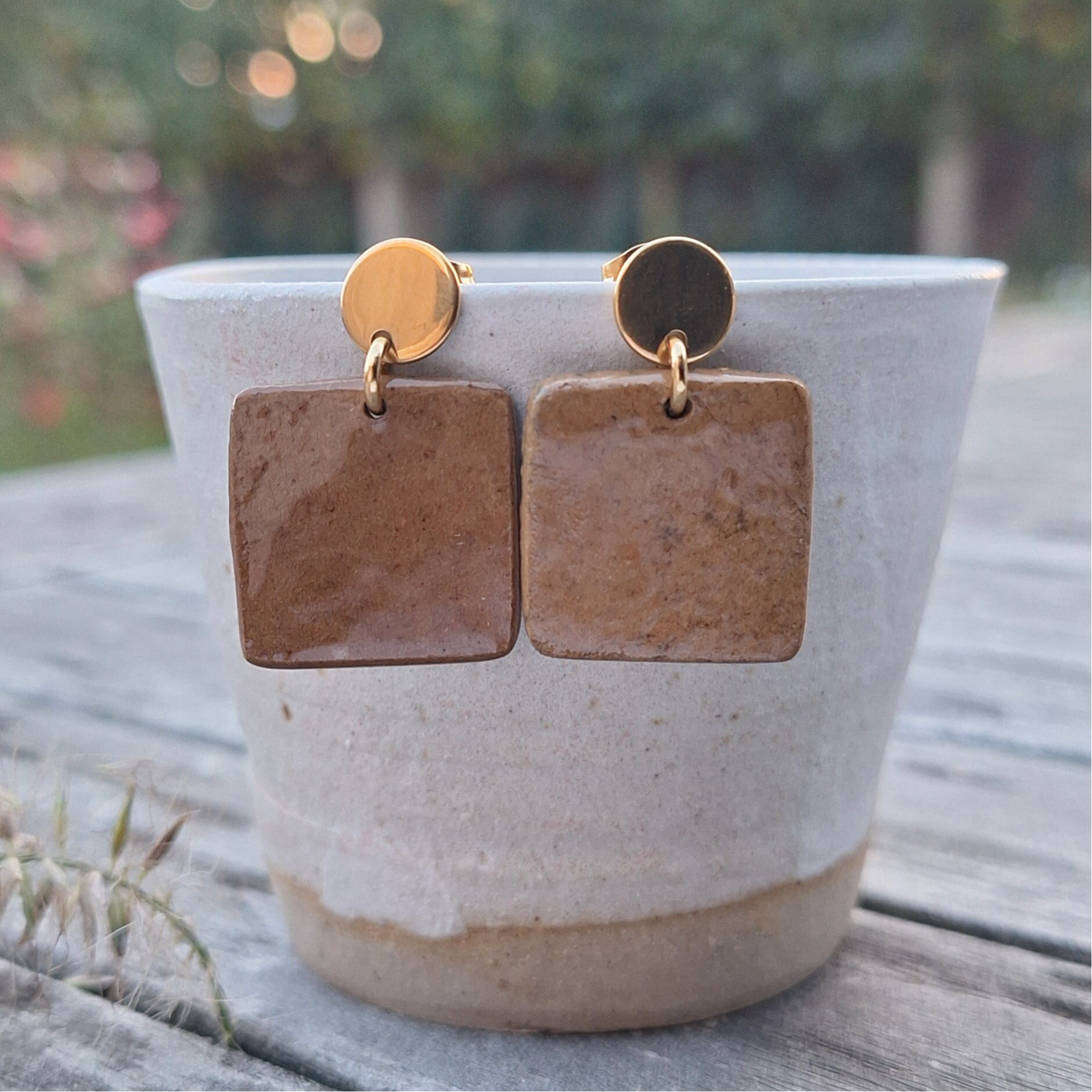 Beige, camel bruine vierkant parel - goud (Chirurgisch staal)