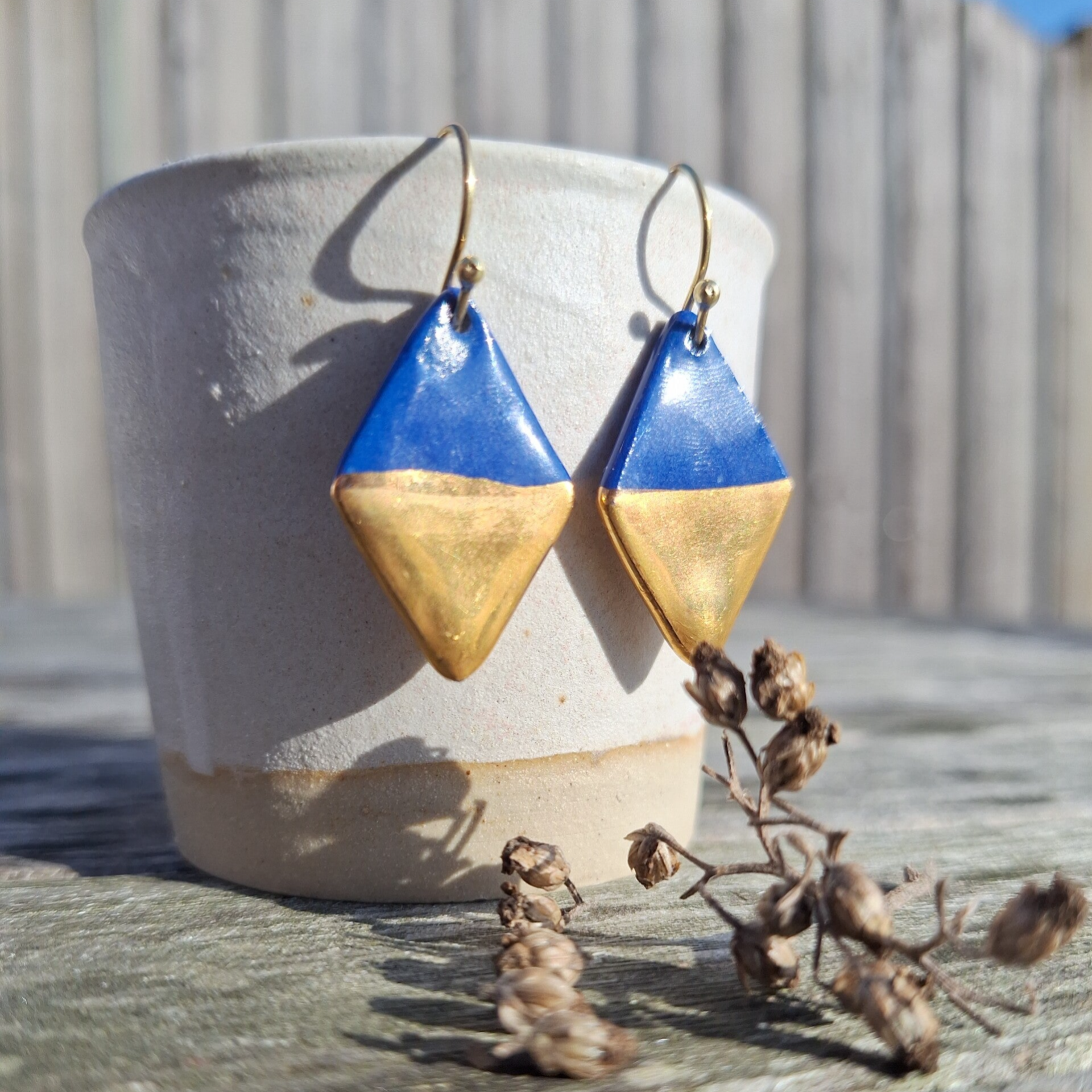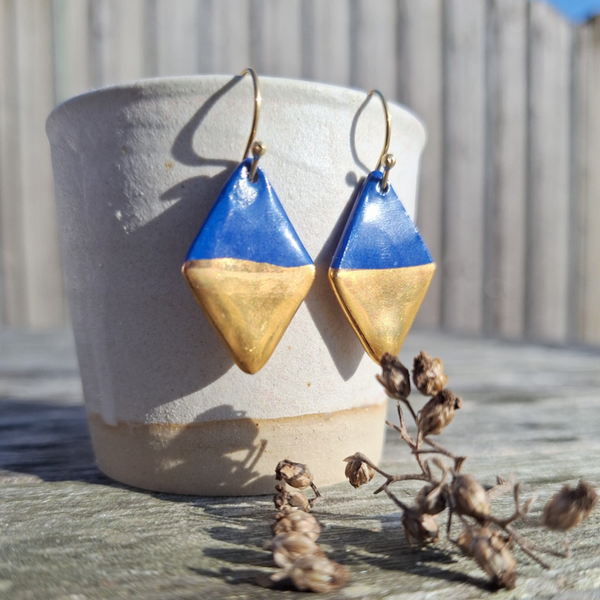 Blauw gouden ruitvormige porselein keramiek oorbellen - Verguld goud