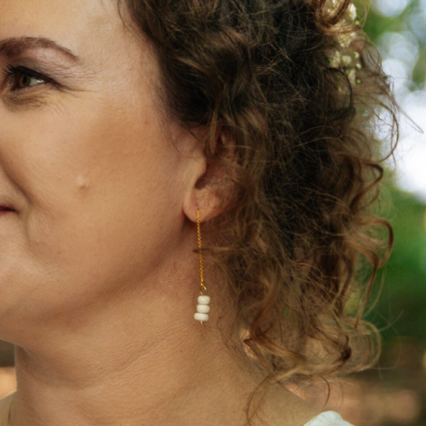 De parels worden samengebracht met vermeil gouden oorbellen. (= Sterling zilveren sieraden onderdelen (eerste gehalte zilver 925) verguld met twee lagen 24 karaats goud.)