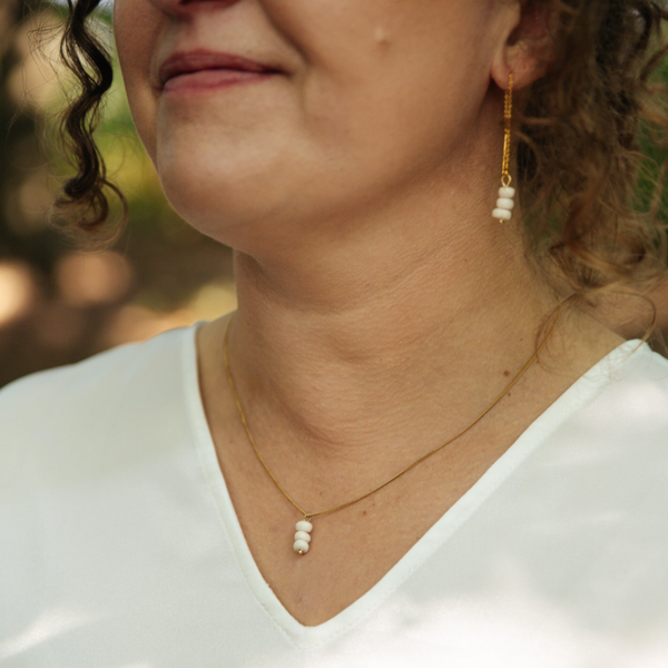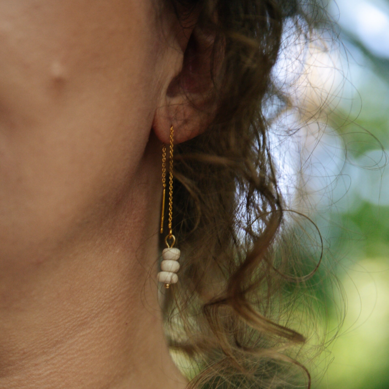 De parels worden samengebracht met vermeil gouden oorbellen. (= Sterling zilveren sieraden onderdelen (eerste gehalte zilver 925) verguld met twee lagen 24 karaats goud.)