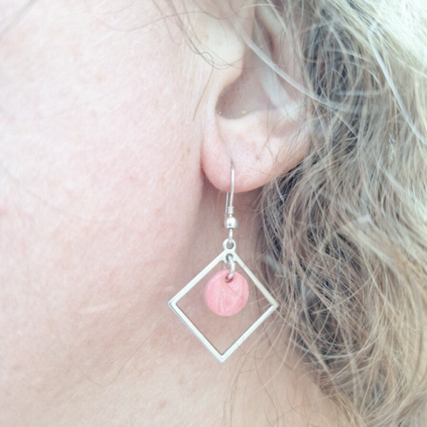 Zilveren ruit met roze porseleinparel - sterling zilver (AG925) oorhangers